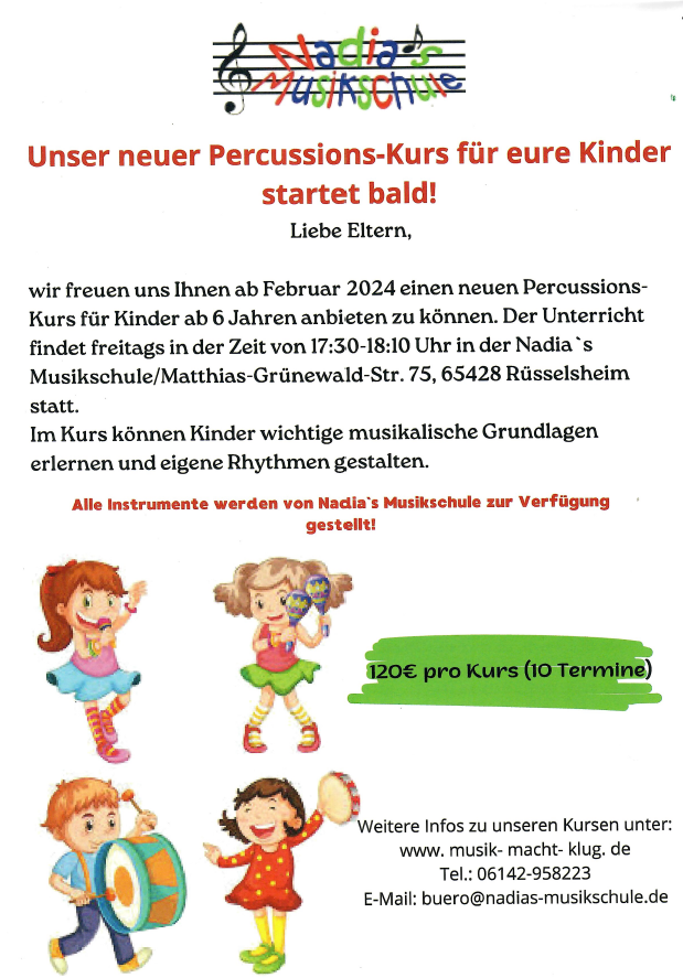 Nadia's Musikschule organisiert auch in diesem Jahr 2024 wieder Percussion-Kurse!
